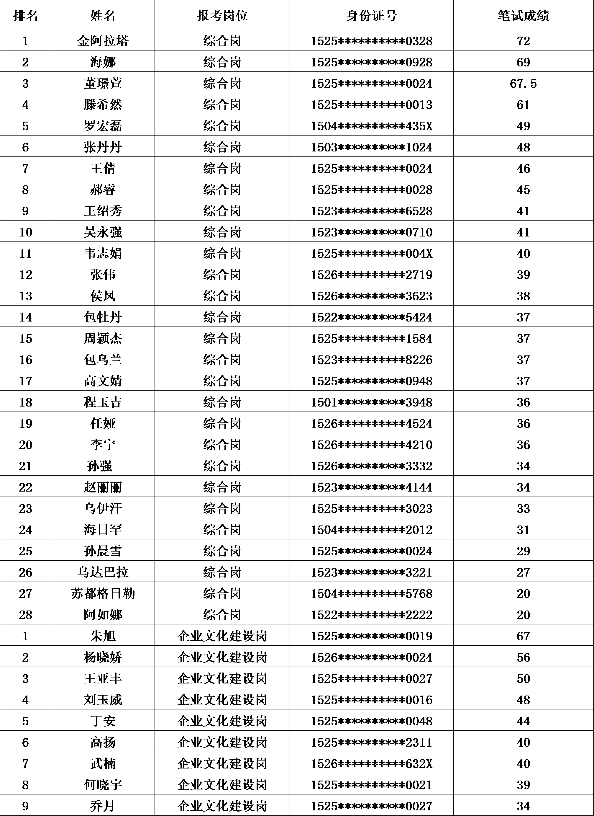 根據(jù)《內(nèi)蒙古農(nóng)村信用社員工招聘管理辦法》(內(nèi)農(nóng)信發(fā)〔2021〕194號(hào))和《二連浩特農(nóng)村合作銀行社會(huì)招聘工作實(shí)施方案》文件要求,二連浩特農(nóng)村合作銀行2022年社會(huì)招聘筆試工作于2022年4月21日組織完成。現(xiàn)將考生筆試成績(jī)公示如下: